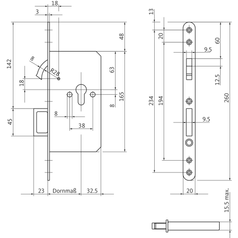 BKS Schiebetürschloss 0353; Produkttyp: Schiebetürschloss; Produkttyp (Hersteller): Schiebetürschloss; Ausführung: mit Springgriff,mit Zirkelriegel; Stulpform: Flachstulp; Material Stulp: Stahl; Schlosskastenhöhe: 165 mm; Schlosskastenstärke: 15,5 mm; Einsatzbereich: Tür; Türart: Schiebetür; Türwerkstoff: Aluminium,Holz; Dornmaß: 55 mm; Lochung: Profilzylinder gelocht; Stulpausführung: kantig; Stulpbreite: 20 mm; Stulplänge: 260 mm; Stulpstärke: 3 mm; Farbton Stulp: nickelsilber; Oberfläche Stulp: lackiert; Zusatzfunktion-/Ausstattung: mit Auslöseknopf; Einbautiefe Schlosskasten: 84,5 mm; Wechsel: ohne Wechsel