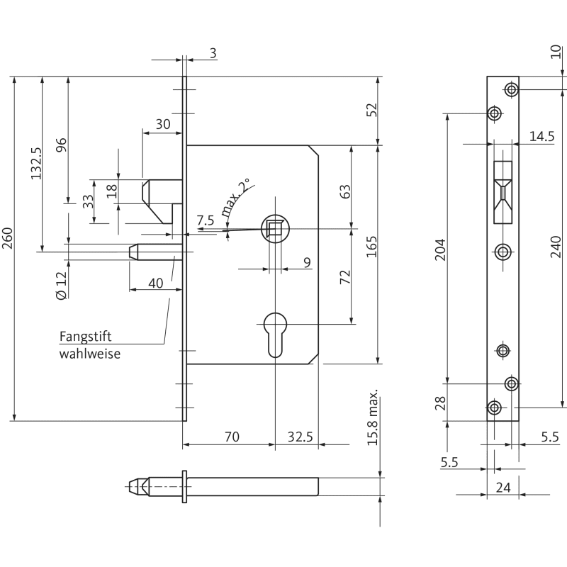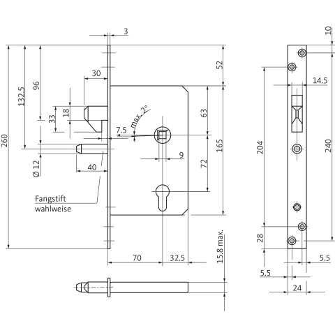 BKS Schiebetürschloss 0381; Produkttyp: Schiebetürschloss; Produkttyp (Hersteller): Einsteck-Schiebetürschloss; Ausführung: mit Hakenfalle; Stulpform: Flachstulp; Material Stulp: Stahl; Schlosskastenhöhe: 165 mm; Schlosskastenstärke: 15,8 mm; Einsatzbereich: Tür; Türart: Schiebetür; Türwerkstoff: Holz,Aluminium; Dornmaß: 80 mm; Drückernussvierkant: 9 mm; Drückernuss: einteilig; Entfernung: 72 mm; Lochung: Profilzylinder gelocht; Stulpausführung: kantig; Stulpbreite: 24 mm; Stulplänge: 260 mm; Stulpstärke: 3 mm; Farbton Stulp: nickelsilber; Oberfläche Stulp: verzinkt; Einbautiefe Schlosskasten: 109,5 mm; Wechsel: mit Wechsel
