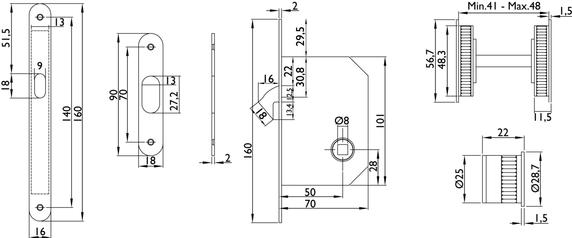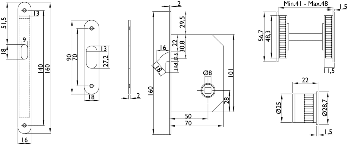 Hermat Schiebetürschloss 3658.SET/157.23,WC/8,D50,F16x160rd, TS 41-48,vern. ma