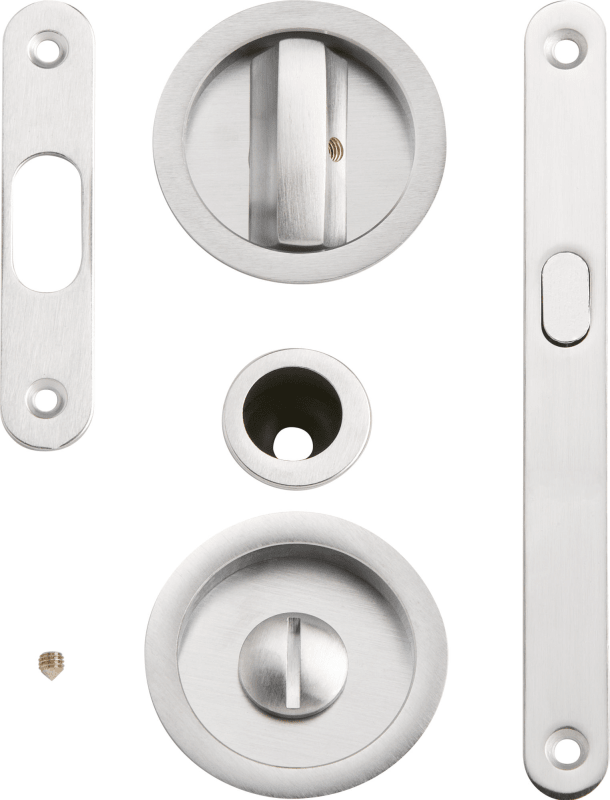 Schiebetürschlossset mit Muschelgriff 3658, Stulp 160 x 16 mm inkl. Schließblech, Muschelgriffpaar 56,7 mm Ø/1 x Aufziehmuschel 3669, Tst. 41 - 48 mm / 6 m Stift mit Hülse 6/8 mm, Oberfl. 20 (Mattnick