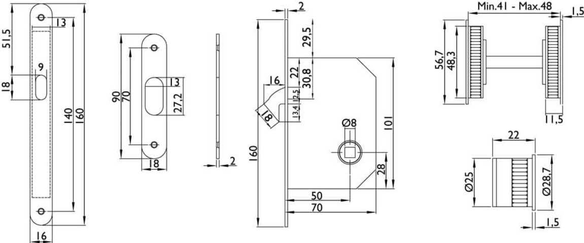 HERMAT Schiebetürschloss 3658.SET/157.23; Produkttyp: Schiebetürschloss; Produkttyp (Hersteller): Schiebetürschloss; Ausführung: mit Hakenschwenkriegel; Stulpform: Flachstulp; Material Stulp: Stahl; Schlosskastenhöhe: 101 mm; Einsatzbereich: Tür; Türart: Schiebetür; Türwerkstoff: Holz; Dornmaß: 50 mm; Lochung: WC gelocht; Stulpausführung: rund; Stulpbreite: 16 mm; Stulplänge: 160 mm; Stulpstärke: 2 mm; Farbton Stulp: edelstahloptik; Oberfläche Stulp: matt; Türstärke min.: 39 mm; Türstärke max.: 44 mm; Einbautiefe Schlosskasten: 70 mm