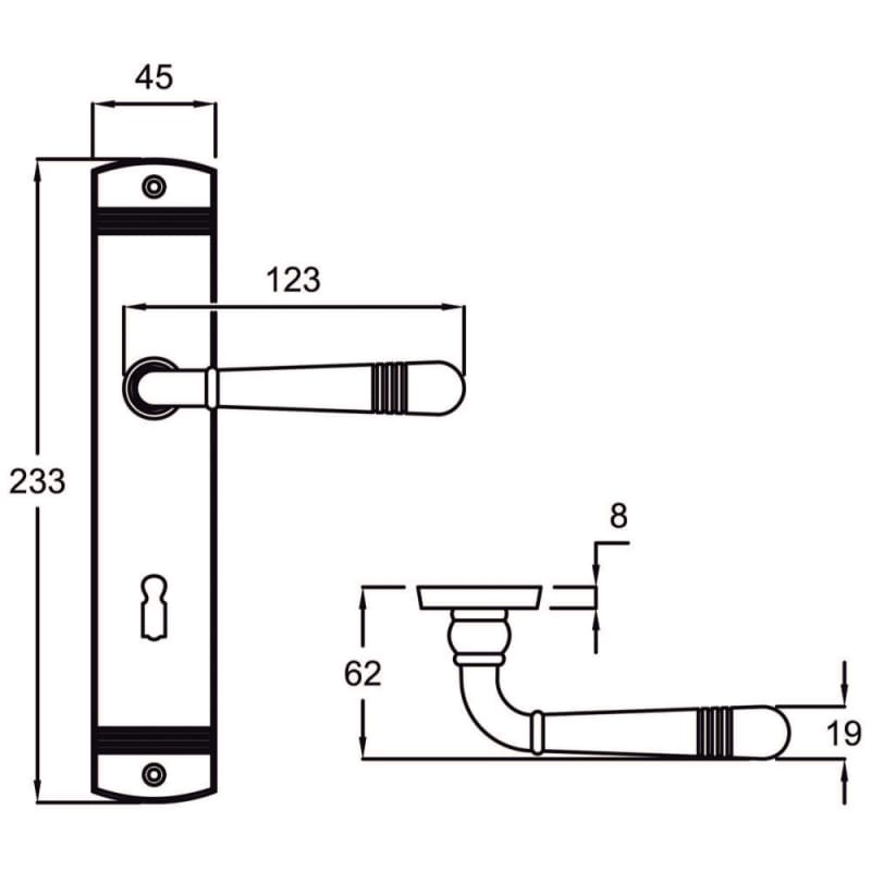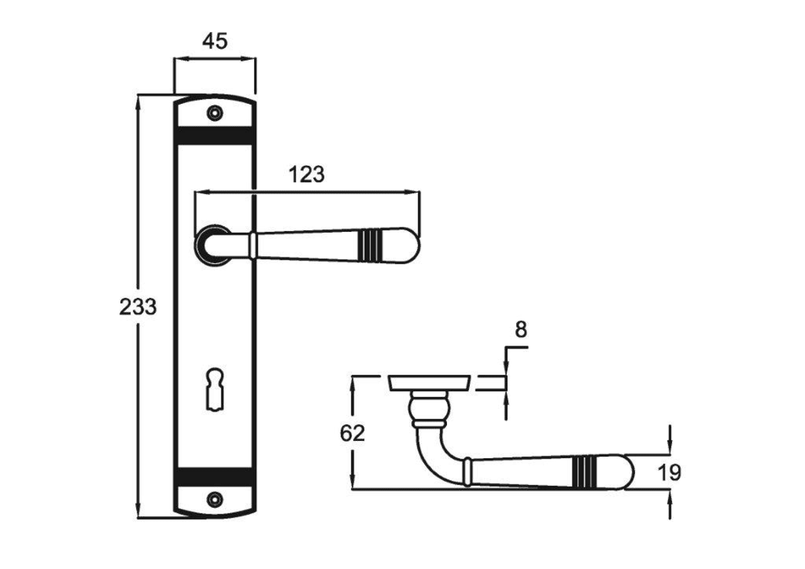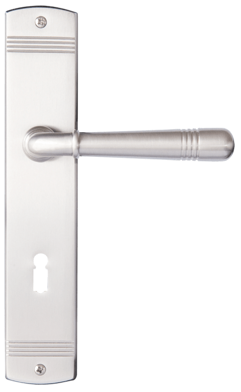 Innentür-Langschildgarnitur Serie Elegance Line, fest-/drehbar gelagert, mit Hochhaltefeder, sichtbare Linsenkopf-Verschraubung.
