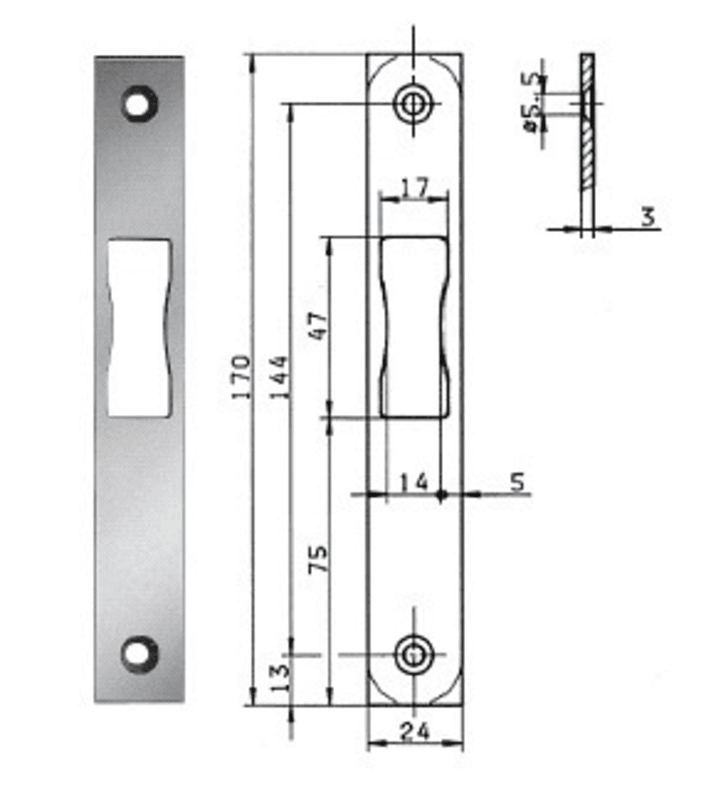 BKS Flachschließblech B 9000; Produkttyp: Flachschließblech; Produkttyp (Hersteller): Schließblech; Ausfräsung: mit Fallenausschnitt; Material: Edelstahl; Einsatzbereich: Türrahmen; Form: kantig; DIN-Richtung: DIN Links-Rechts; Farbton: edelstahl; Oberfläche: matt; Schließblechbreite: 24 mm; Schließblechlänge: 170 mm; Schließblechstärke: 3 mm