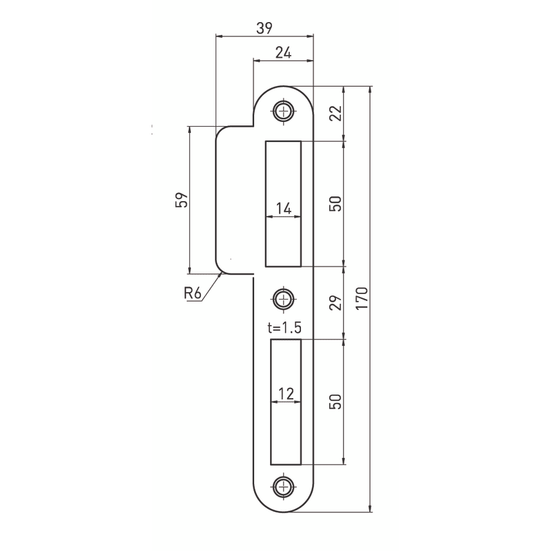 BMH Zimmertür-Lappenschließblech Nr. S07, abgerundet. Lieferbare Oberflächen: silberfarbig lackiert (Standard), Messing, Edelstahl. Sonderausführung: Riegel-Lappenschließblech S07R, Fallen-Lappenschließblech S07F.