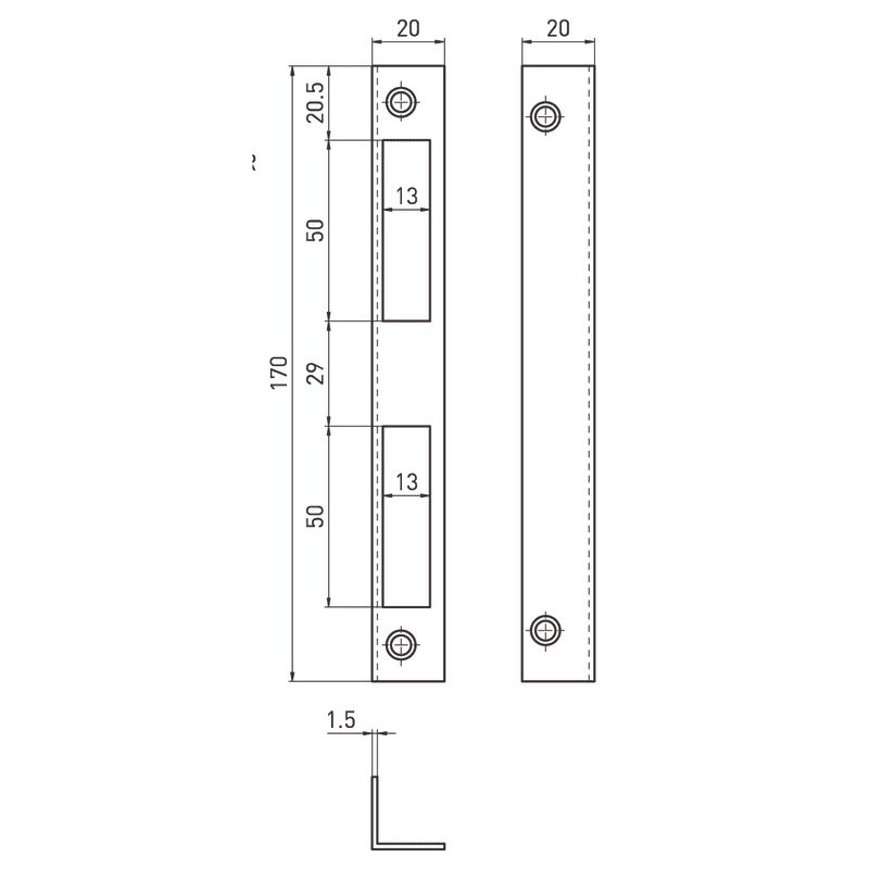 BMH Zimmertür-Winkelschließblech Nr. S08, kantig. Lieferbare Oberflächen: silberfarbig lackiert (Standard), Messing, Edelstahl.