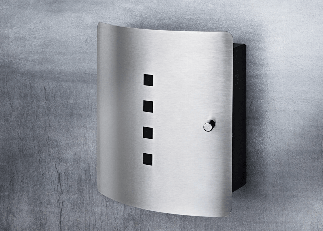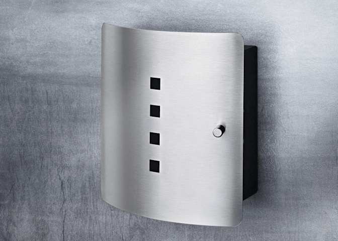 Schlüsselbox mit Edelstahl-Tür. Schlichtes Design. Praktischer Magnetverschluss. Schwarzes Stahlblechgehäuse.