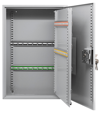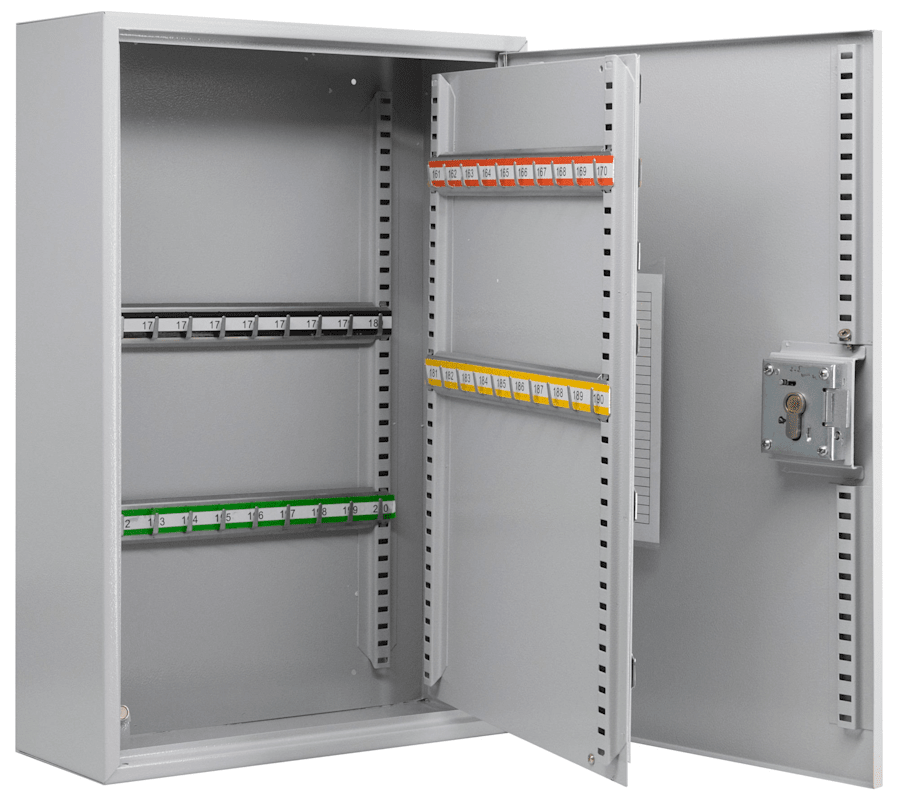 Sicher. Übersichtlich. Durchdacht. Die BURG-WÄCHTER Schlüsselschränke der Serie 6850 bietet eine praktische Lösung für die Aufbewahrung von Schlüsseln, ideal für Gewerbe und Verwaltung. Das Modell überzeugt durch ihre hochwertige Pulverbeschichtung und ein funktionales Design. Farbige, verstellbare Hakenleisten und passende Schlüsselanhänger erleichtern die Zuordnung und das Auffinden der Schlüssel. Das herausnehmbare Schlüsselregister sorgt für Übersichtlichkeit, auch bei intensiver Nutzung.