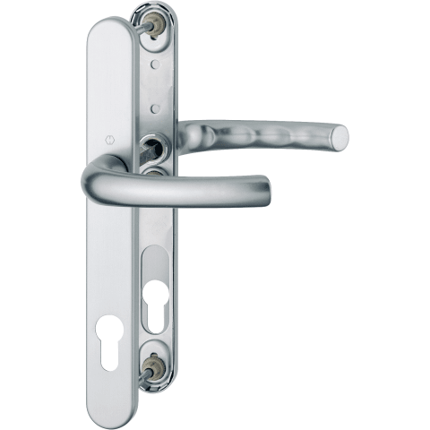 HOPPE-Aluminium-Schmalschild-Türgriff-Garnitur für Profiltüren: • Lagerung: Türgriffe fest/drehbar, wartungsfreie Gleitlager • Verbindung: HOPPE-Vollstift • Unterkonstruktion: Edelstahl, Stütznocken •
