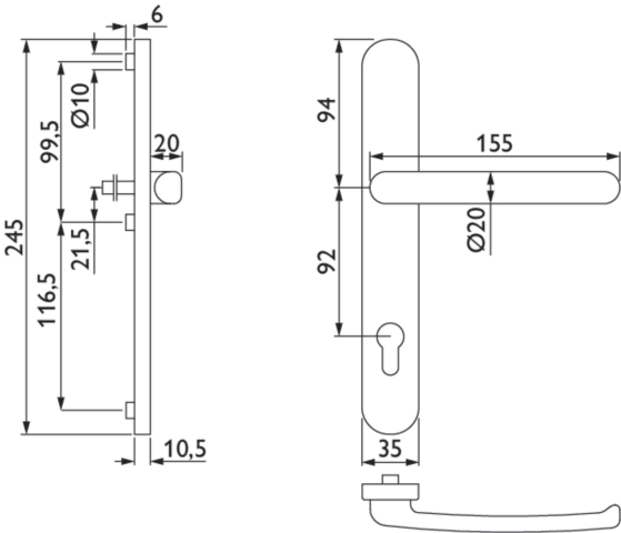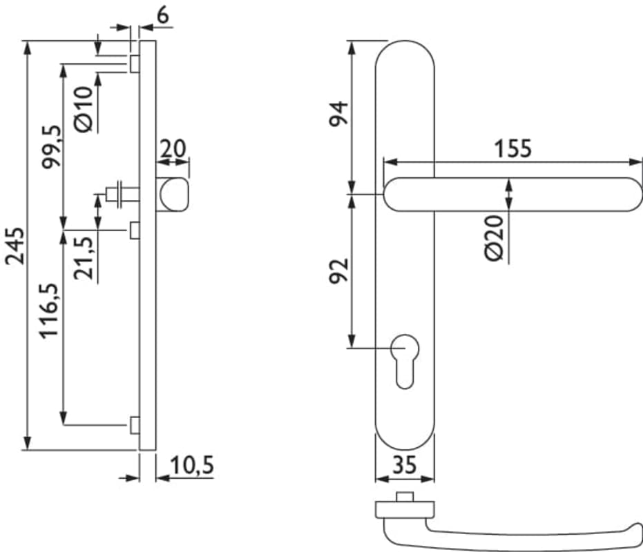 Schmalrahmen-Halbgarnitur außen 1956 nieder, mit Schild 2082, fest/drehbar, Ausf.: 92 mm PZ, ohne Befestigungsmaterial, Drücker niedere Ausführung, Schild mit Gewindenoc, Oberfl. 36 (braun beschichtet