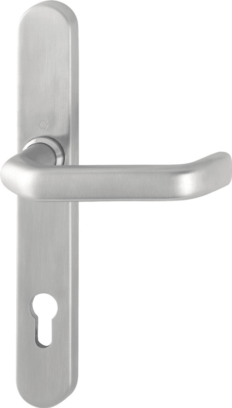 HOPPE Drückergarnitur Liverpool E1313G/3357N, Langschild, oval, Profilzylinder gelocht, Entfernung 92mm, Vierkant 8mm, DIN Links-Rechts, Türstärke 57 - 62mm, mit Stütznocken, edelstahl matt, festdrehb