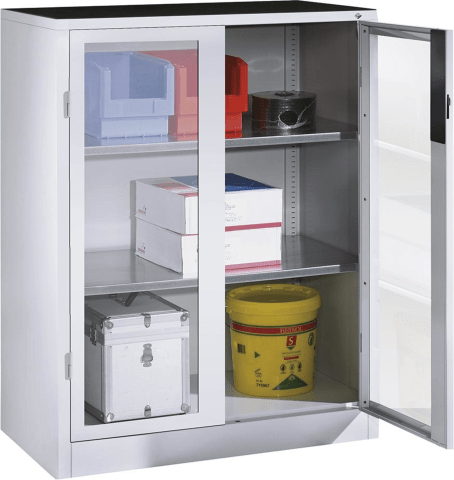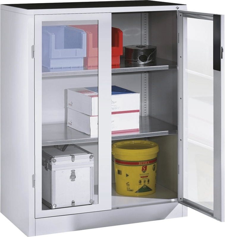 Beistellschrank, mit Sichtfenster • Langlebige Stahlblechkonstruktion • Material: Stahlblech mit hochwertiger Einbrennbeschichtung • Sichtfenster: 3-mm-Acrylglas • Türen: Scharniere außen liegend, ca