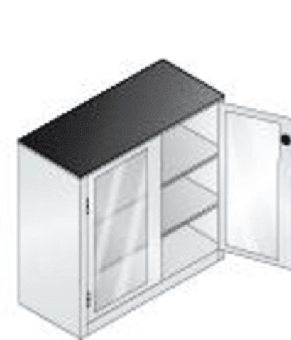 Beistellschrank, mit Sichtfenster • Langlebige Stahlblechkonstruktion • Material: Stahlblech mit hochwertiger Einbrennbeschichtung • Sichtfenster: 3-mm-Acrylglas • Türen: Scharniere außen liegend, ca. 180°-Öffnungswinkel • Griffe: Ergo-Lock-Griff • Verschluss: patentiertes, 3-riegeliges Griffschloss Ergo-Lock 4.0 mit 2 Schlüsseln • Oberfläche: Gummiriefen-Matte • Fachböden: im 15-mm-Raster höhenverstellbar, verzinkt