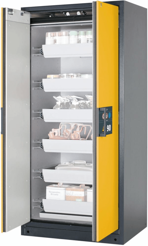 Gefahrstoffschrank Q-PEGASUS-90, mit 6 Auszugswannen • Außenkorpus: aus kunststoffbeschichtetem Feinstahlblech • Innenkorpus: aus chemisch-resistenten Spezialplatten • Struktur-Pulverbeschichtung: Korpus RAL 7016 anthrazit, Türen in RAL 1004 goldgelb • Brandschutzdämmung: mit hochwertigen Fugendichtungen • Türen: 3-fache Türaufhängung, zwei Türen lassen sich mit einer Hand bedienen, Türen arretieren in der serienmäßigen Türfeststellanlage, für ein sicheres Ein-/Auslagern der Gebinde, abschließbar mit Profilzylinder (schließanlagenfähig) und Schließ-Zustandsanzeige (rot/grün) • Schließautomatik: nach ca. 60 Sekunden werden die arretierten Türen gelöst, optisches und akustisches Warnsignal vor der Türschließung • Erdungsanschluss: im Dachbereich • Sicherheitselemente korrosionsgeschützt außerhalb des Lagerraums montiert • Transport: integrierter Transportsockel mit abnehmbarer, optionaler Sockelblende • Aufstellung: Justiervorrichtungen zum Ausgleich von Bodenunebenheiten • Sicherheit: Feuerwiderstandsfähigkeit 90 Minuten, typgeprüft, GS-geprüft • Kennzeichnung: gemäß DIN EN 14470-1 Lieferung: Schrank mit 6 Auszugswannen inklusive Bodenauffangwanne gem. StawaR. Hinweis: Zur sicheren Lagerung von Gefahrstoffen in Arbeitsräumen gemäß DIN EN 14470-1 und TRGS 510.