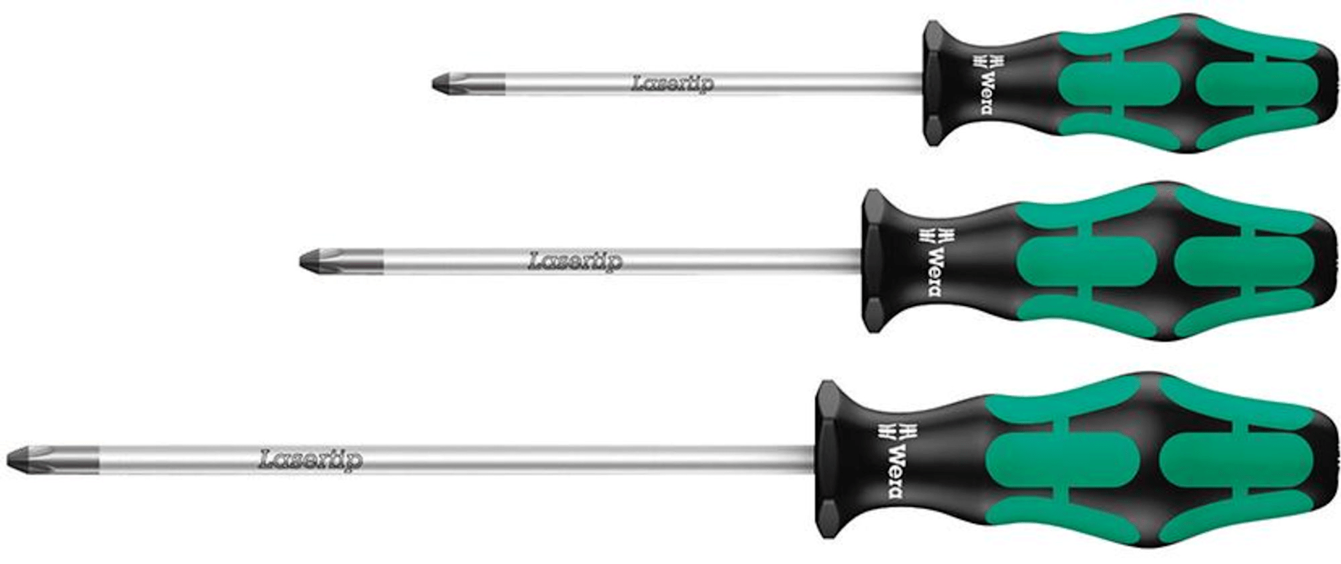 Schraubendreher-Satz, Nr. 350/3 P • Runde Kling • Nicromat • Hochlegierter Sonderstah • Lasertip-Spitze, verhindert das Herausrutschen aus dem Schraubenkop • Kraftform-Grif • 6-kant-Abrollschut • Ko