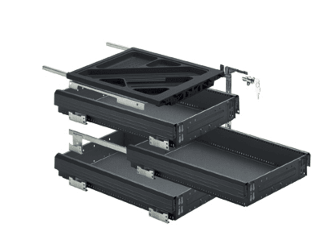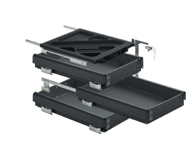 Set besteht aus: • 1 Stück Schreibmaterialschale 40 mm• 1 Garnitur Auszugsführung Quadro 12,   Teilauszug mit Dämpfung Silent System, Belastbarkeit 6 kg• 3 Stück Stahlschubkästen• 3 Garnitur