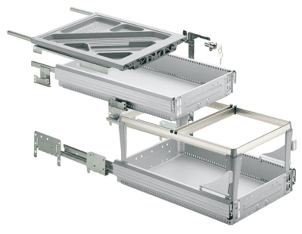 Set besteht aus: • 1 Stück Schreibmaterialschale 40 mm• 1 Garnitur Auszugsführung Quadro 12,   Teilauszug mit Dämpfung Silent System, Belastbarkeit 6 kg• 1 Stück Stahlschubkasten• 1 Stück St