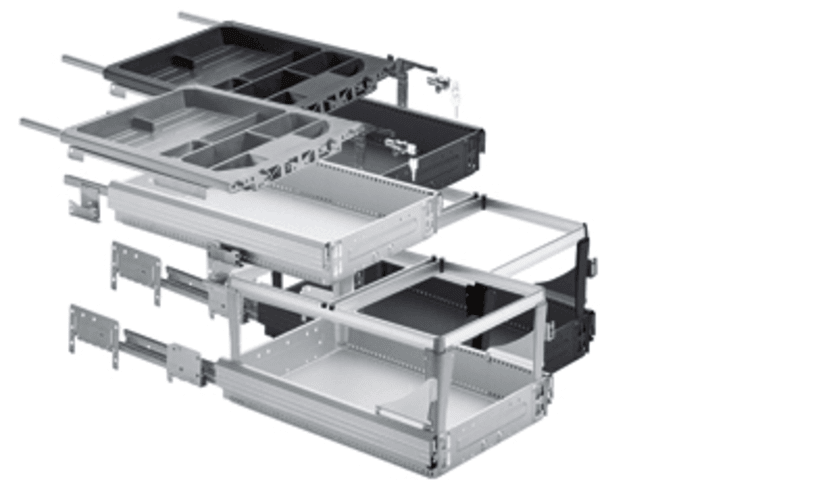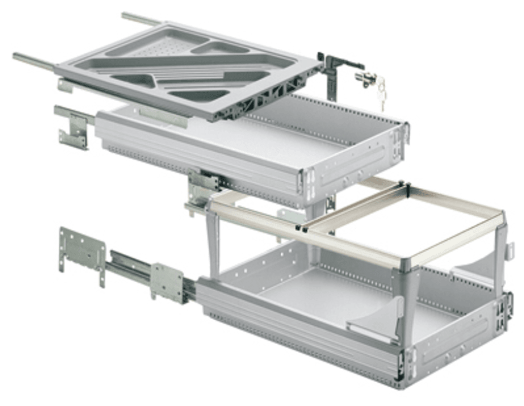 Container-Set mit Teil- und Überauszügen, Einbautiefe (min) 730 mm, Aluminium Optik