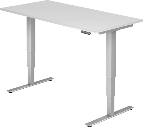 Schreibtischserie X, höhenverstellbar 635–1285 mm • Gestell: Quadratstahlrohr, silber pulverbeschichtet • Tischplatte: melaminharzbeschichtete Spanplatte nach DIN 68765 Emissionsklasse E1 E05 TSCA, 25 mm dick, mit 2-mm-ABS-Kanten, gerundet • Stahlrahmen: unter der Tischplatte, 40 x 20 mm, Rechteckrohr mit abklappbarer Kabelwanne • 2 Motoren: in den Säulen integriert • Hubgeschwindigkeit: ca. 36 mm/sec. • Höhenjustierung: ± 5 mm • Mit Schutzkontaktstecker • Stufenlos höhenverstellbar • Bedienung: erfolgt über einenen Memory-Schalter mit 4 Speicherplätzen, Sanft-Anlauf/Sanft-Stopp mit Auffahrschutz • Display Memory-Schalter: links/rechts unter der Tischplatte montierbar • Abschaltung bei Nichtgebrauch, Stromverbrauch im Stand-by 0,3 Watt Lieferung: Erfolgt zerlegt. Hinweis: Eine Verkettung ist nicht möglich. Wichtig, der Sicherheitsspalt zwischen den Arbeitsplätzen sollte 30 mm sein.