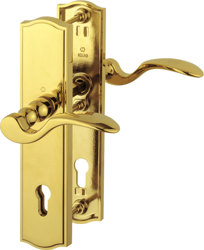 HOPPE Vollblatt Sicherheits-Drückergarnitur Meran M112SH/371A/370,Langschild,ES 1,ohne Zylinderabdeckung 72/8,DIN Links,messingfarben poliert-Resista,Türstärke37-42,geschwungen/geschwungen