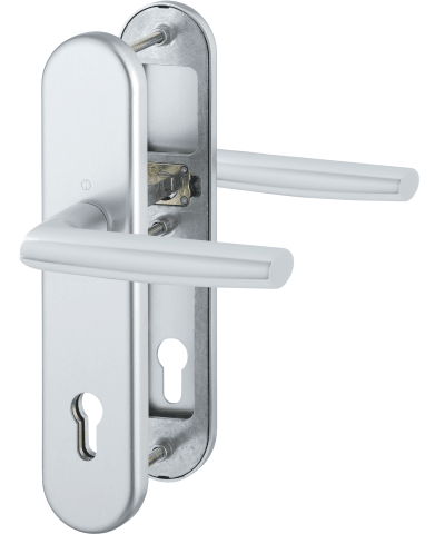 HOPPE-Aluminium-Schutz-Langschild-Drücker-Garnitur für Außen-/Wohnungsabschluss-Türen: • zertifiziert nach DIN 18257 ES1, Objekt-Garnitur • Lagerung: außen Türgriff lose, ummontierbar; innen Türgriff