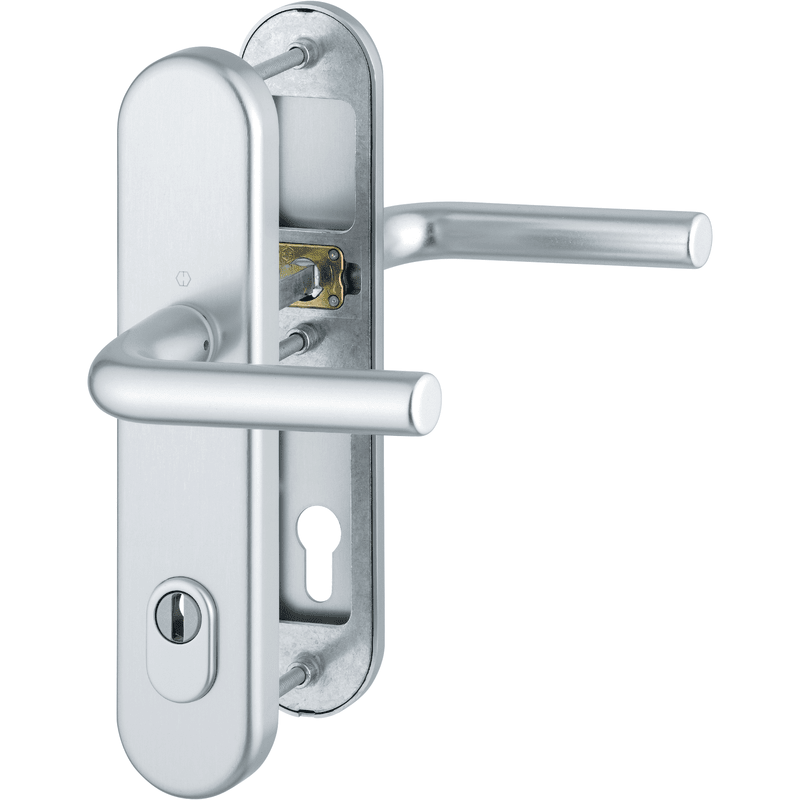 Aluminium-Schutzbeschlag (Drücker-Garnitur) ES1 (SK2): geprüft nach DIN 18257, Stahl-Unterkonstruktion im Außen- und Innenschild; außen: gekröpfter, feststehender Knopf (ummontierbar), Zylinder-Abdeck