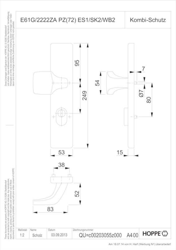 HOPPE Vollblatt Sicherheits-Halbgarnitur E61G/2222ZA,Langschild,ES 1,mit Zylinderabdeckung 92/10/8,DIN Links-Rechts,schwarz matt eloxiert,Türstärke67-72,gekröpft fest