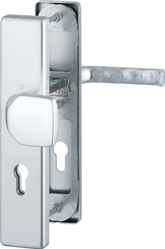 HOPPE Sicherheits-Wechselgarnitur London 61G/2221/2210/113, Langschild eckig, 12mm, ES 1, ohne Zylinderabdeckung, Profilzylinder gelocht, Entfernung 72mm, Vierkant 8mm,Türstärke 37-47mm, naturfarben e