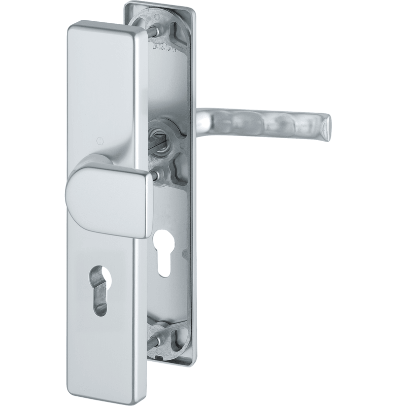 HOPPE-Aluminium-Schutz-Langschild-Wechsel-Garnitur für Außen-/Wohnungsabschluss-Türen: • erfüllt die Anforderungen nach DIN 18257 ES0 (SK1) • Lagerung: außen gekröpfter Knopf fest, ummontierbar; innen