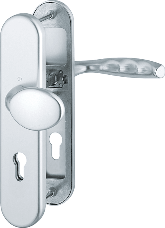 HOPPE Vollblatt Sicherheits-Wechselgarnitur New York 76G/3331/3410/1810H,Langschild,ES 1,ohne Zylinderabdeckung 72/8,DIN Links-Rechts,naturfarben eloxiert,Türstärke41-46,gekröpft/gebogen fest