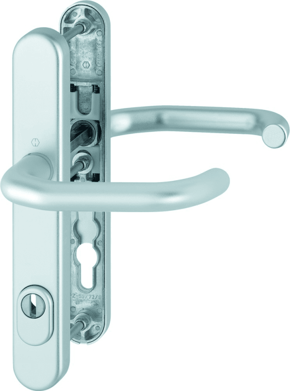 HOPPE® Schutz-Drückergarnitur Paris 138GF/3359ZA/3357N; Abdeckung: Schmalschild; Widerstandsklasse: ES 1 (SK2); Form: oval; Vierkant: 8 mm; Material: Aluminium; Lagerung: festdrehbar,Rückholfeder,wart