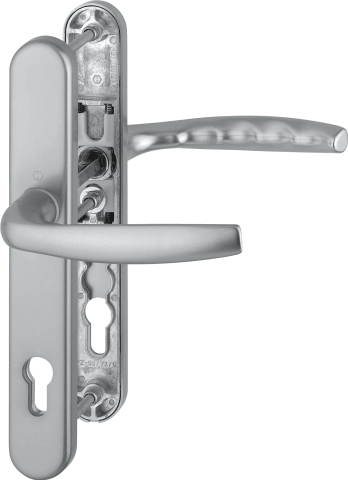 HOPPE Rohrrahmen Sicherheits-Drückergarnitur New York 1810G/3358/3357N,Langschild,ES 1,ohne Zylinderabdeckung 92/8,DIN Links-Rechts,stahlfarbig eloxiert,Türstärke72-77,gebogen/gebogen