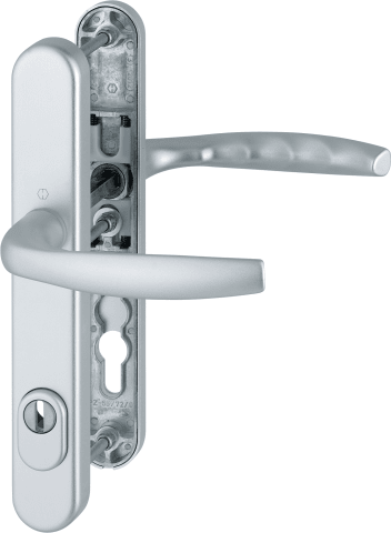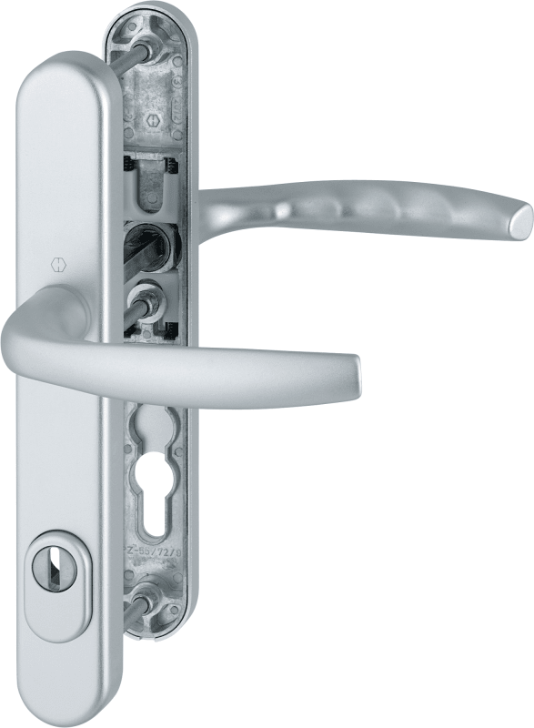 HOPPE Rohrrahmen Sicherheits-Drückergarnitur New York 1810G/3359ZA/3357N,Langschild,ES 1,ohne Zylinderabdeckung 92/8,DIN Links-Rechts,natur matt eloxiert,Türstärke67-72,gebogen/gebogen