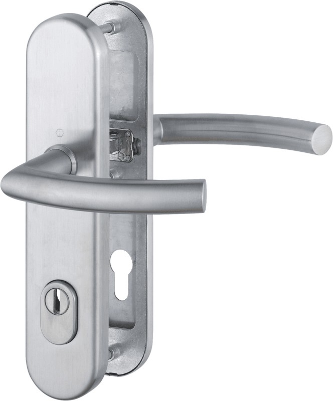 HOPPE Vollblatt Sicherheits-Drückergarnitur Trondheim E1430Z/3332ZA/3310,Langschild,ES 1,mit Zylinderabdeckung 92/10,DIN Links-Rechts,edelstahl matt,Türstärke67-72,Gehrung gebogen/Gehrung gebogen