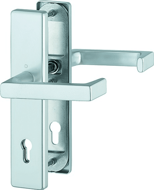 HOPPE® Schutz-Drückergarnitur Detroit FS-1644F/2221/2210; Abdeckung: Langschild; Widerstandsklasse: ES 1 (SK2); Form: eckig; Vierkant: 9 mm; Material: Aluminium; Lagerung: Gleitlager,wartungsfrei,fest