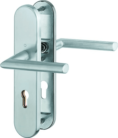 HOPPE® Schutz-Drückergarnitur Stockholm FS-E1140F/3331/3310; Abdeckung: Langschild; Widerstandsklasse: ES 1 (SK2); Form: oval; Vierkant: 9 mm; Material: Edelstahl; Lagerung: festdrehbar,Gleitlager,war