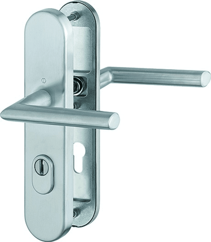 HOPPE® Schutz-Drückergarnitur Stockholm FS-E1140F/3332ZA/3310; Abdeckung: Langschild; Widerstandsklasse: ES 1 (SK2); Form: oval; Vierkant: 9 mm; Material: Edelstahl; Lagerung: Gleitlager,festdrehbar,w