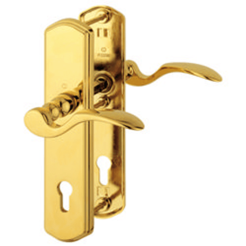 Messing-Garnitur (Drücker-Garnitur) mit Stahlanbohrschutz: außen: gehärteter Stahlanbohrschutz im Zylinderbereich, loser Türgriff; innen: loser Türgriff, HOPPE-FDW-Profilstift-Verbindung, hochfeste, s