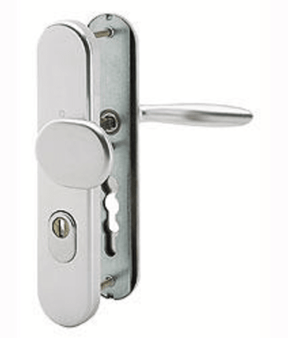 Aluminium- Schutzbeschlag ES1 (SK2) mit Ziehschutz: geprüft nach DIN 18257, Stahlunterkonstruktion im Au~en- und Innenschild. Auf Anfrage auch mit anderen Lochteilen lieferbar!