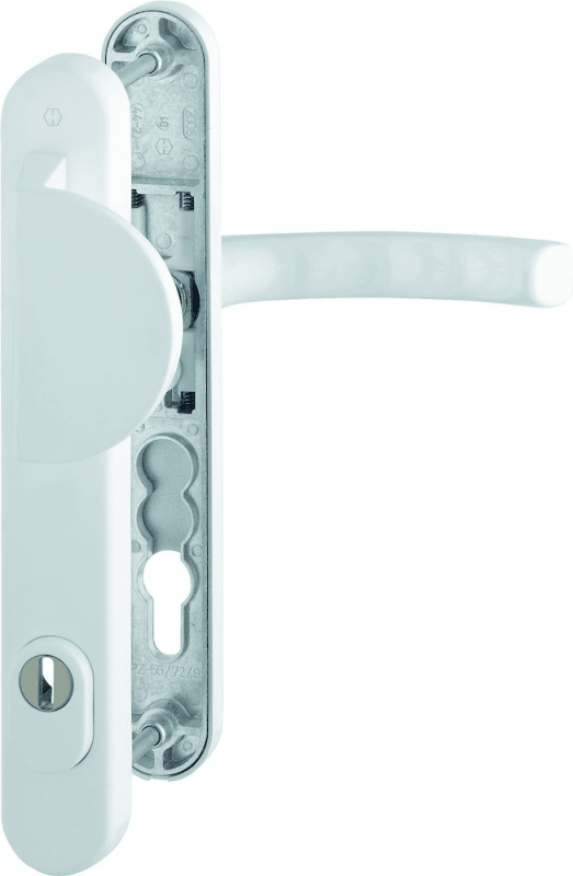 HOPPE® Schutz-Wechselgarnitur Liège 554/3359ZA/3357N/1540; Material: Aluminium; Befestigungsart: verdeckt verschraubt; Vierkant: 8 mm; Befestigungstechnik: mit Stütznocken; Abdeckung: Schmalschild; Lagerung: Gleitlager,wartungsfrei,Hochhaltemechanik; Form: oval; Schildstärke innen: 10 mm; Einsatzbereich: Profiltür; Basis: Schutz-Wechselgarnitur; Ausführung: mit Zylinderabdeckung; Lochung: Profilzylinder gelocht; Entfernung: 92 mm; Türstärke min.: 67 mm; Befestigungssystem: Stiftverbindung; Türstärke max.: 72 mm; Drückerbefestigung: Vollstift; Norm: DIN 18257; DIN-Richtung: DIN Links-Rechts; Eigenschaft: Griffplatte fest auf Schild; Farbton: verkehrsweiß; Türart: Außentüren,Rahmentüren; Anschlagrichtung: Drücker rechts/links verwendbar; Türwerkstoff: Aluminium,Kunststoff; Prüfung: RAL-GZ; Schildbreite außen: 36 mm; Schildbreite innen: 36 mm; Schildlänge außen: 250 mm; Schildlänge innen: 250 mm; Griffplattenform: halbrund; Drückerhöhe: 56 mm; Drückerlänge: 132 mm; Material Unterkonstruktion innen: Zamak; Material Unterkonstruktion außen: Stahl; Schildstärke außen: 15 mm; Griffplattenlänge: 80 mm; Griffplattenhöhe: 40 mm; Griffplattenbreite: 64 mm; für Zylinderüberstand min.: 10 mm; für Zylinderüberstand max.: 18 mm; Drückerform: gebogen