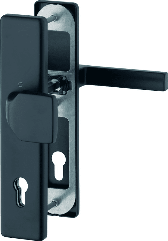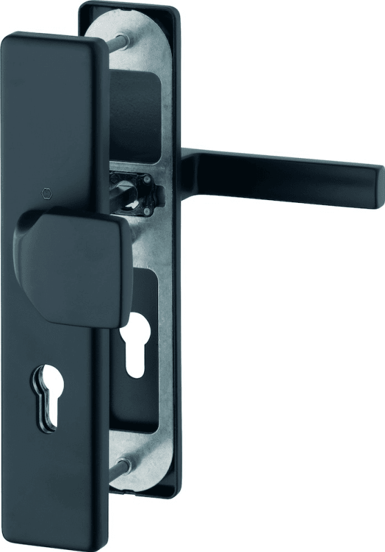 HOPPE® Schutz-Wechselgarnitur Austin 61G/2221/2210/1769; Material: Aluminium; Befestigungsart: verdeckt verschraubt; Vierkant: 8 mm; Befestigungstechnik: mit Stütznocken; Abdeckung: Langschild; Lagerung: Rückholfeder,Gleitlager,wartungsfrei,lose; Widerstandsklasse: ES 1 (SK2); Form: eckig; Benutzerklasse: Klasse 3; Schildstärke innen: 10 mm; Einsatzbereich: Wohnungseingangstür; Basis: Schutz-Wechselgarnitur; Lochung: Profilzylinder gelocht; Entfernung: 72 mm; Türstärke min.: 42 mm; Befestigungssystem: Schnellstiftverbindung; Türstärke max.: 47 mm; Drückerbefestigung: Vollstift; Norm: DIN 18257,DIN EN 1906; DIN-Richtung: DIN Links-Rechts; Farbton: schwarz matt; Türart: Außentüren; Anschlagrichtung: Drücker rechts/links verwendbar; Türwerkstoff: Holz,Stahl; Schildbreite außen: 54 mm; Schildbreite innen: 54 mm; Schildlänge außen: 250 mm; Schildlänge innen: 250 mm; Drückerhöhe: 49 mm; Drückerlänge: 128 mm; Drückerbreite: 22 mm; Material Unterkonstruktion innen: Zamak; Material Unterkonstruktion außen: Stahl; Knopfform: gekröpft; Schildstärke außen: 12 mm; Knopfbreite: 83 mm; Knopflänge: 54 mm; Knopfhöhe: 52 mm; Drückerform: L-Form
