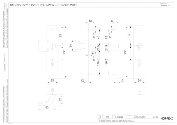 HOPPE Vollblatt Sicherheits-Wechselgarnitur 61G/2221/2210,Langschild,ES 1,ohne Zylinderabdeckung 72/8,DIN Links-Rechts,schwarz matt eloxiert,Türstärke37-47,gekröpft fest