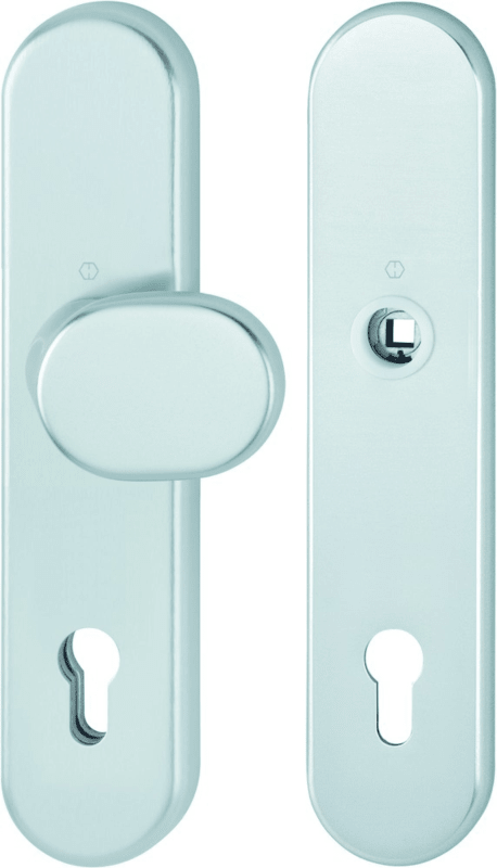 HOPPE Vollblatt Sicherheits-Wechselgarnitur 86G/3331/3310,Langschild,ES 1,ohne Zylinderabdeckung 92/10/8,DIN Links-Rechts,naturfarben eloxiert,Türstärke67-77,gekröpft fest