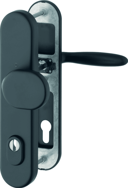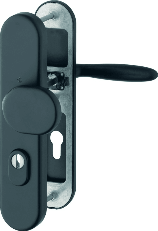 HOPPE® Schutz-Wechselgarnitur Verona 86G/3332ZA/3310/1510; Material: Aluminium; Befestigungsart: verdeckt verschraubt; Vierkant: 10 mm; Befestigungstechnik: mit Stütznocken; Abdeckung: Langschild; Lagerung: Gleitlager,wartungsfrei,lose,Rückholfeder; Widerstandsklasse: ES 1 (SK2); Form: oval; Schildstärke innen: 10 mm; Einsatzbereich: Haustür; Basis: Schutz-Wechselgarnitur; Ausführung: mit Zylinderabdeckung; Lochung: Profilzylinder gelocht; Entfernung: 92 mm; Türstärke min.: 67 mm; Befestigungssystem: Schnellstiftverbindung; Türstärke max.: 72 mm; Drückerbefestigung: Vollstift; Norm: DIN 18257,DIN EN 1906; DIN-Richtung: DIN Links-Rechts; Farbton: schwarz matt; Türart: Außentüren; Anschlagrichtung: Drücker rechts/links verwendbar; Türwerkstoff: Stahl,Holz; Schildbreite außen: 54 mm; Schildbreite innen: 54 mm; Schildlänge außen: 250 mm; Schildlänge innen: 250 mm; Drückerhöhe: 54 mm; Drückerlänge: 124 mm; Material Unterkonstruktion innen: Zamak; Material Unterkonstruktion außen: Stahl; Knopfform: gekröpft; Schildstärke außen: 15 mm; Knopfbreite: 87 mm; Knopflänge: 54 mm; Knopfhöhe: 50 mm; für Zylinderüberstand min.: 10 mm; für Zylinderüberstand max.: 18 mm; Drückerform: gerade