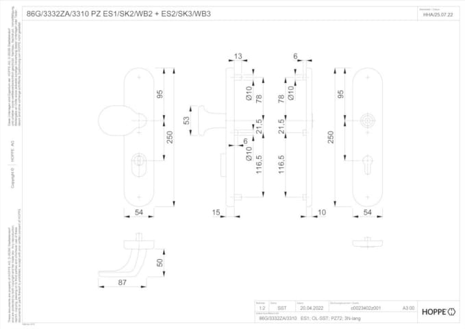 HOPPE Vollblatt Sicherheits-Wechselgarnitur 86G/3332ZA/3310,Langschild,ES 1,ohne Zylinderabdeckung 92/10/8,DIN Links-Rechts,verkehrsweiß beschichtet,Türstärke67-77,gekröpft fest