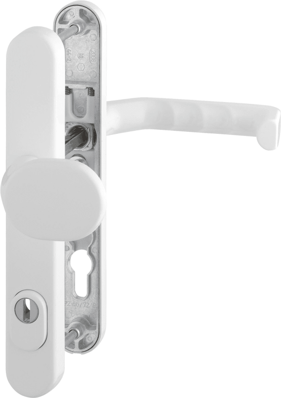 HOPPE Rohrrahmen Sicherheits-Wechselgarnitur Liverpool 86G/3359ZA/3357N/1313G,Langschild,ES 1,mit Zylinderabdeckung 92/8,DIN Links-Rechts,verkehrsweiß beschichtet,Türstärke57-62,gekröpft/U-Form gekröp