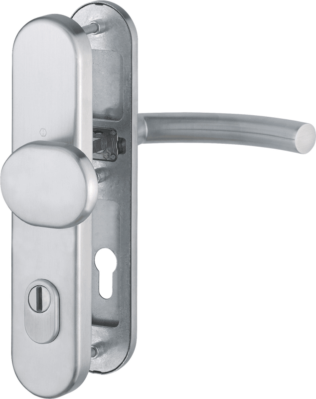 HOPPE Vollblatt Sicherheits-Wechselgarnitur Trondheim E86G/3332ZA/3310/1430Z,Langschild,ES 1,mit Zylinderabdeckung 92/10,DIN Links-Rechts,edelstahl matt,Türstärke67-72,gekröpft/Gehrung gebogen fest