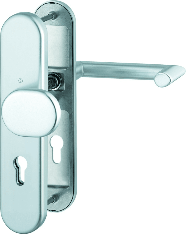 HOPPE® Schutz-Wechselgarnitur Karlstad FS-86G/3331/3310/1141F; Material: Aluminium; Befestigungsart: verdeckt verschraubt; Vierkant: 9 mm; Befestigungstechnik: mit Stütznocken; Abdeckung: Langschild;