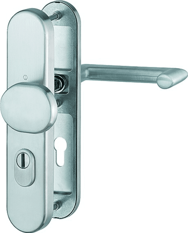 HOPPE® Schutz-Wechselgarnitur Karlstad FS-E86G/3332ZA/3310/1141F; Material: Edelstahl; Befestigungsart: verdeckt verschraubt; Vierkant: 9 mm; Befestigungstechnik: mit Stütznocken; Abdeckung: Langschil
