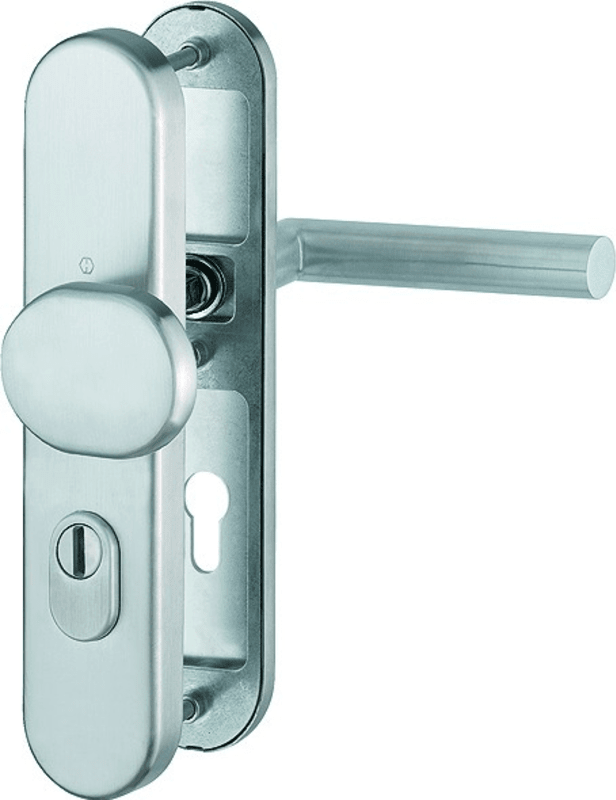 HOPPE® Schutz-Wechselgarnitur Amsterdam FS-E86G/3332ZA/3310/1400F; Material: Edelstahl; Befestigungsart: verdeckt verschraubt; Vierkant: 9 mm; Befestigungstechnik: mit Stütznocken; Abdeckung: Langschi