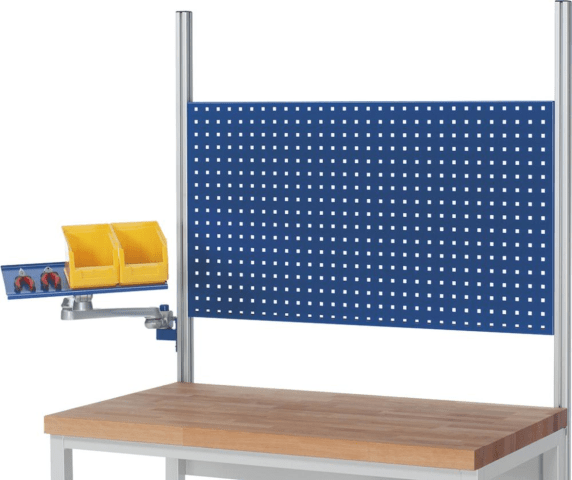 Schwenkarm, mit Tablar • Tablar (neigbar) B x T: 450 x 250 mm mit Aufkantungen • Schwenkarm mit 3 Gelenken (auch für Tastaturaufnahme geeignet) • Geeignet für alle Feldbreiten • Belastbarkeit: max. 15 kg • Montage an: Systemstützen (allseitig)